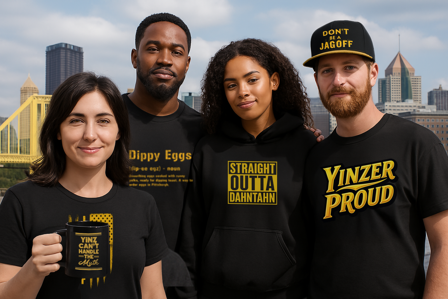 At Yinzergear, we turn Steel City pride into bold, funny, and heartfelt designs. From black & gold to "n’at" and "jagoff," our Pittsburgh-inspired gear celebrates the true spirit of the 'Burgh. Designed for Yinzers everywhere.